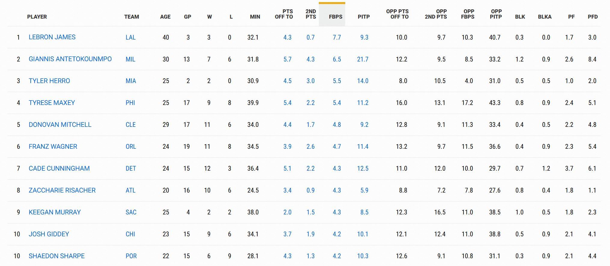 詹姆斯本賽季代表湖人出戰(zhàn)3場常規(guī)賽,場均登場32分鐘得到17.7分5籃板8.7助攻,據(jù)NBA官網(wǎng)數(shù)據(jù)統(tǒng)計顯示,詹姆斯的場均FBPS(fast break points快攻得分)為7.7分,超越字母哥的6.5分排名全聯(lián)盟第一。