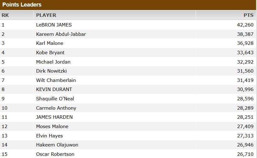 截至目前,詹姆斯以42260分排名NBA歷史總得分榜第一位,杜蘭特是現(xiàn)役球員得分第二名,目前得到了30996分。