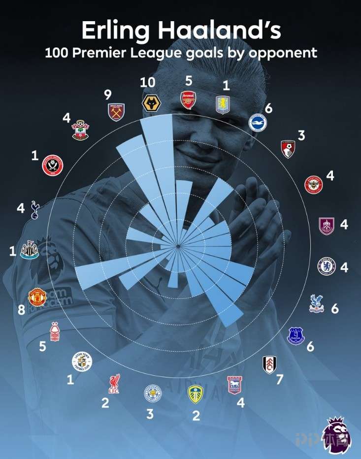 英超官方曬哈蘭德百球分布:狼隊10球最多 曼聯(lián)8球槍手5球