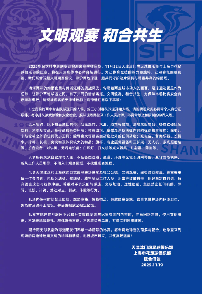 雷速體育11月19日訊 本賽季中超最后一輪開始前,將在最后一輪直接交鋒的對(duì)手天津津門虎和上海申花發(fā)布了聯(lián)合倡議書。