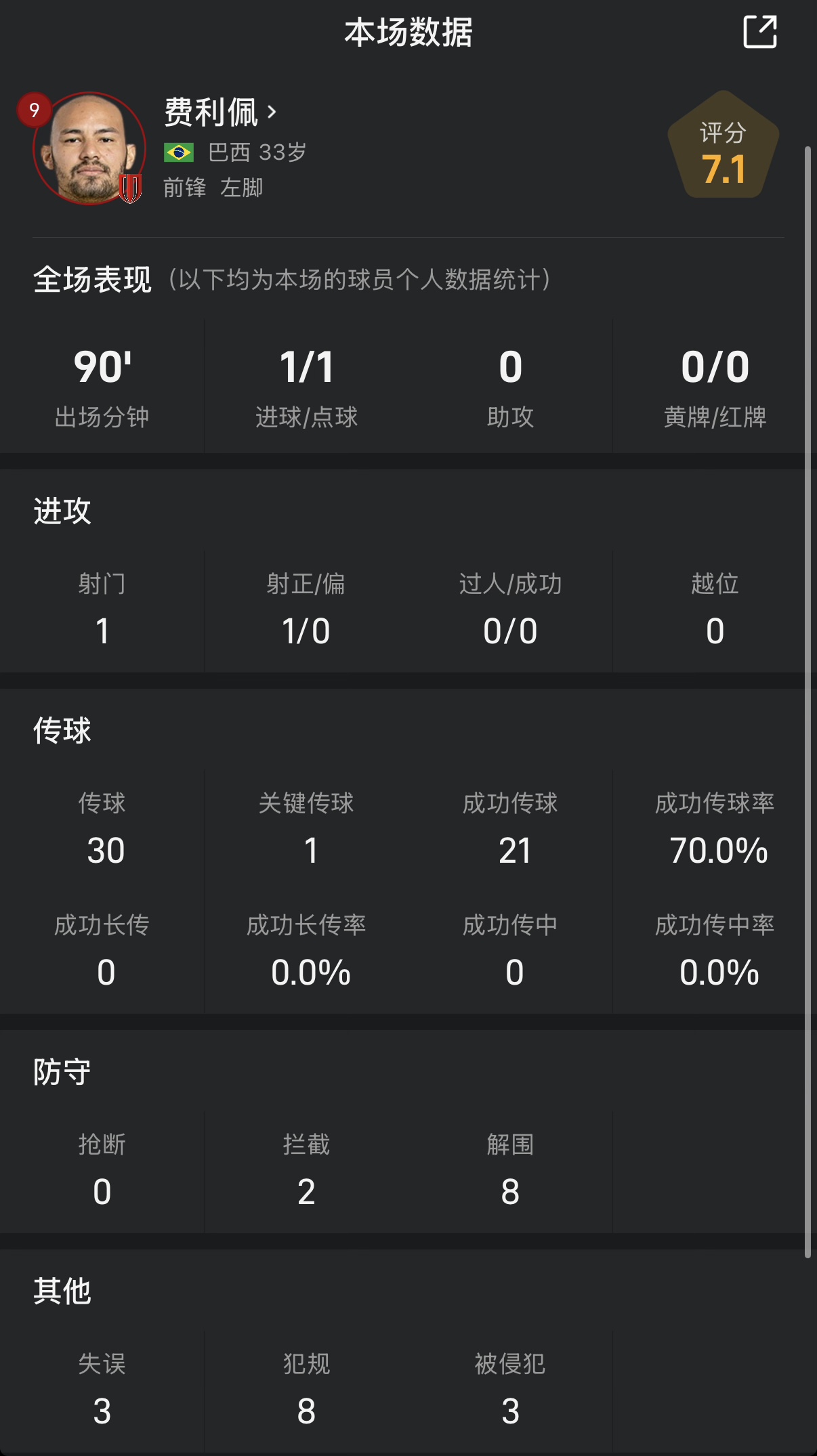 費利佩全場數據:防守端貢獻8解圍,點射為球隊首開記錄