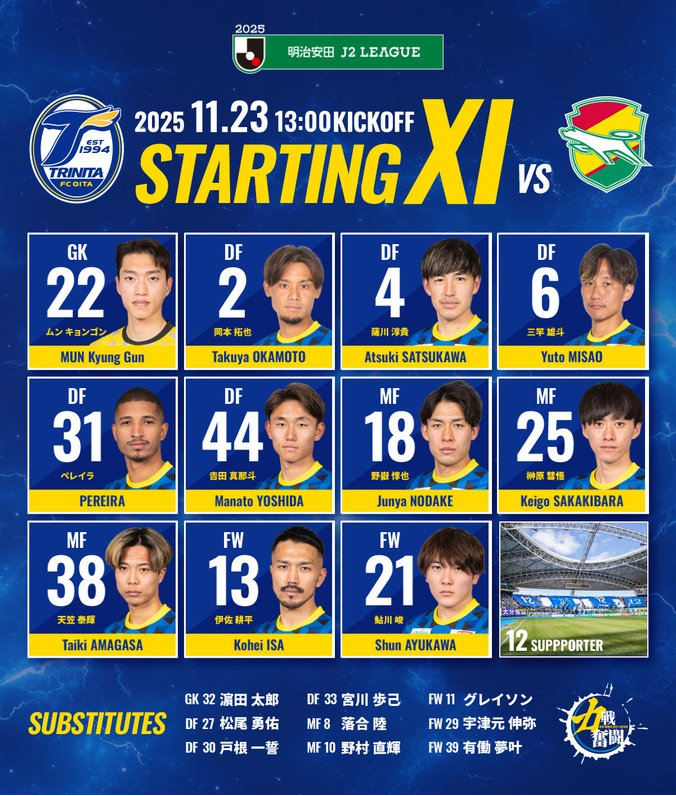 大分三神vs千葉市原首發(fā):鲇川峻先發(fā),卡里尼奧斯在列