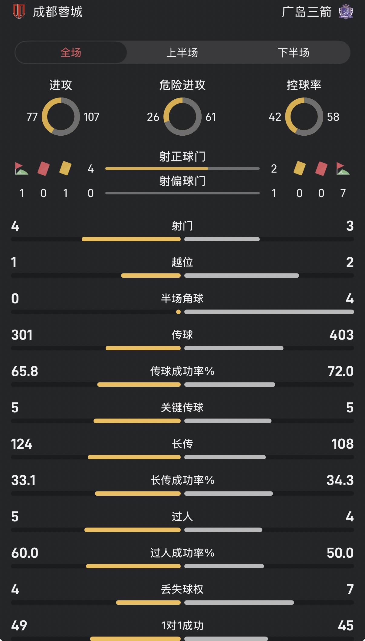 蓉城vs廣島全場數(shù)據(jù)對比:控球率42-58,射門4-3