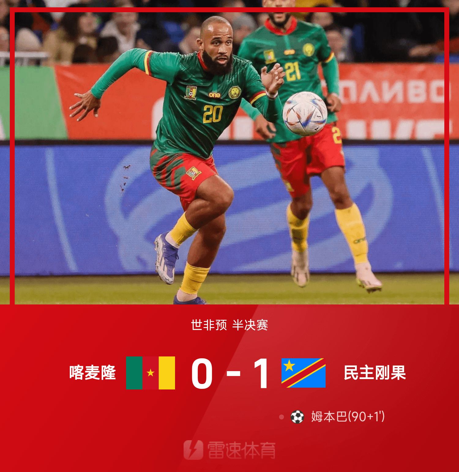 雷速體育11月14日訊 26賽季世非預(yù)半決賽,民主剛果1-0戰(zhàn)勝喀麥隆,姆本巴第90+1分鐘上演絕殺??溌∈婪穷A(yù)半決賽出局,無(wú)緣美加墨世界杯。