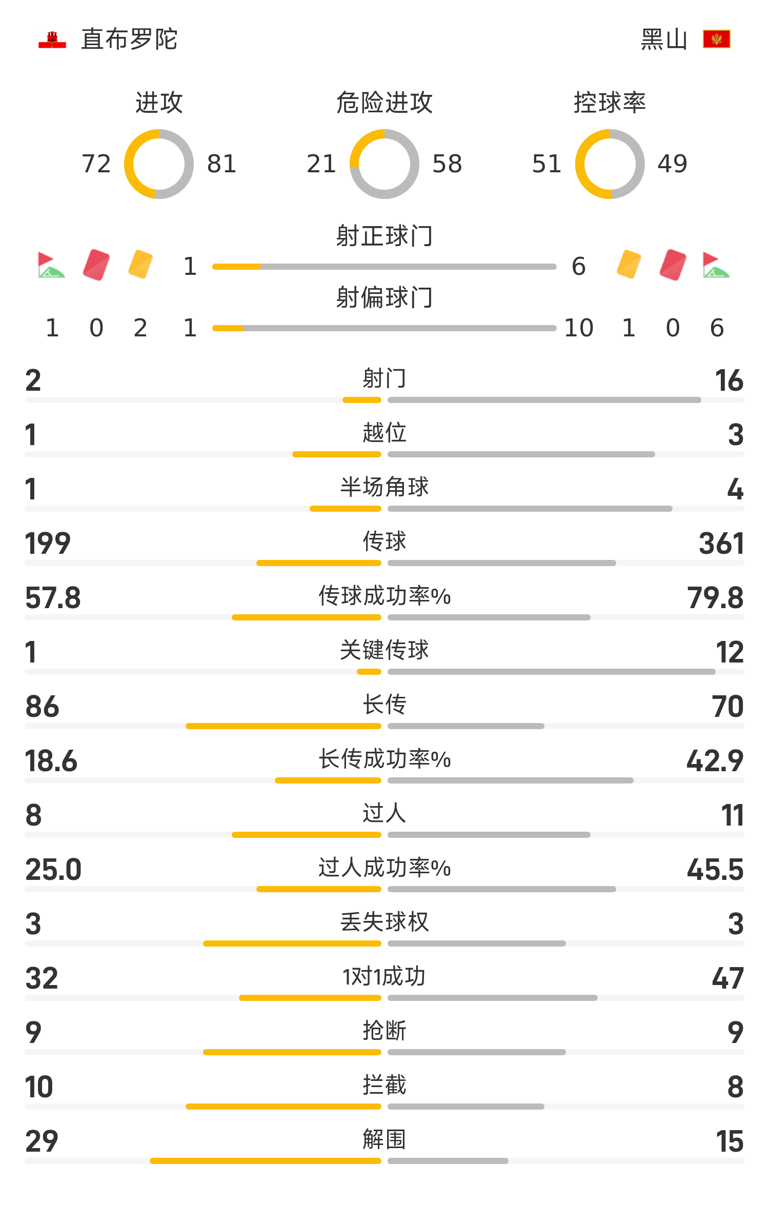 33’阿季奇主罰任意球起右腳推射命中,黑山1-1直布羅陀