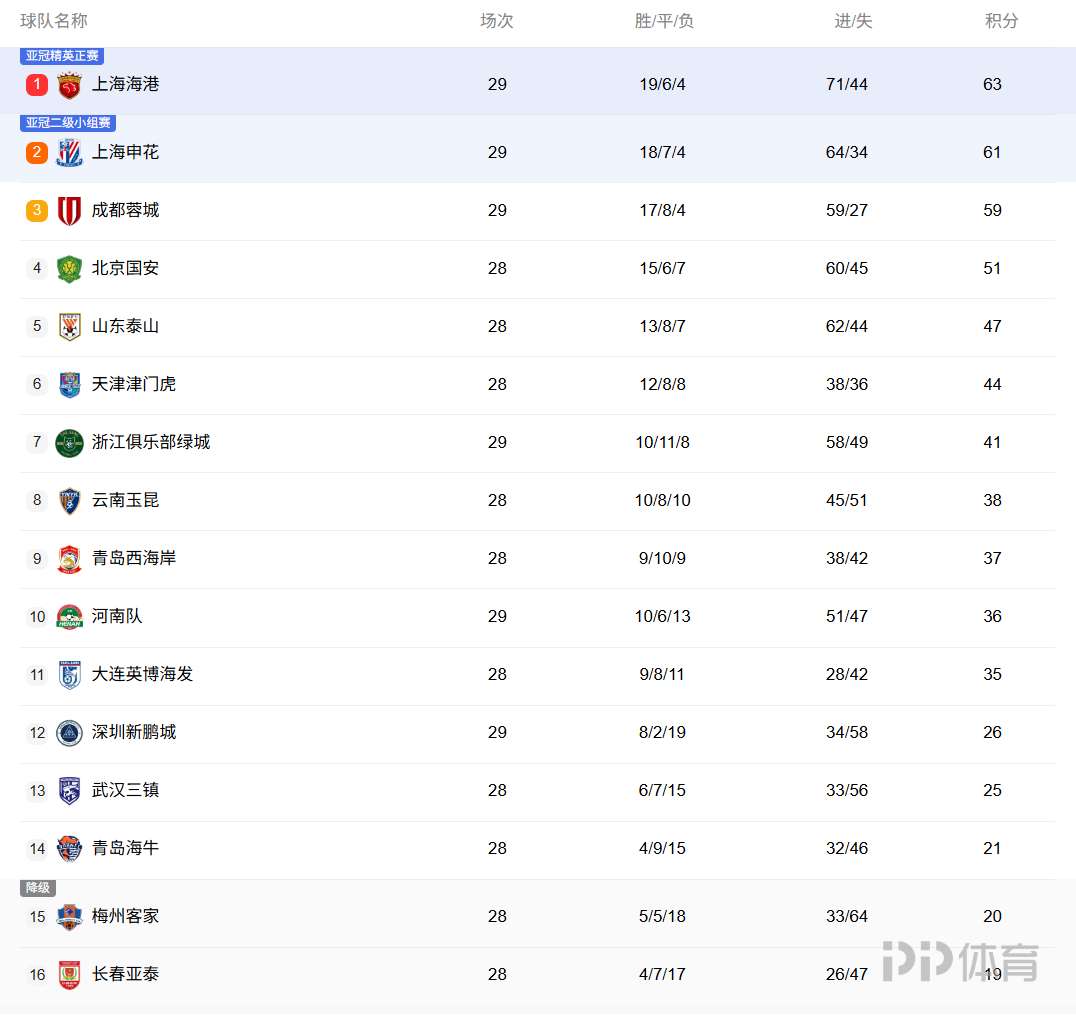 中超第29輪結(jié)束3場關(guān)鍵較量,上海海港3-0浙江,上海申花1-0深圳新鵬城,成都蓉城1-2河南。中超積分榜上,海港領(lǐng)先申花2分,末輪只要打平即可奪冠,成都蓉城則提前一輪退出了冠軍爭奪。