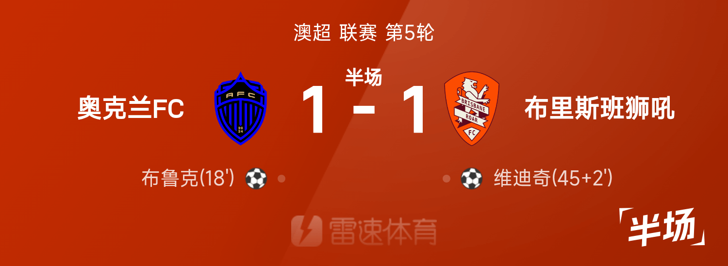 雷速體育11月23日訊 25/26賽季澳超聯賽第5輪,奧克蘭FC迎戰(zhàn)布里斯班獅吼。半場戰(zhàn)罷,雙方比分暫為奧克蘭FC1-1布里斯班獅吼,布魯克、維迪奇破門建功。