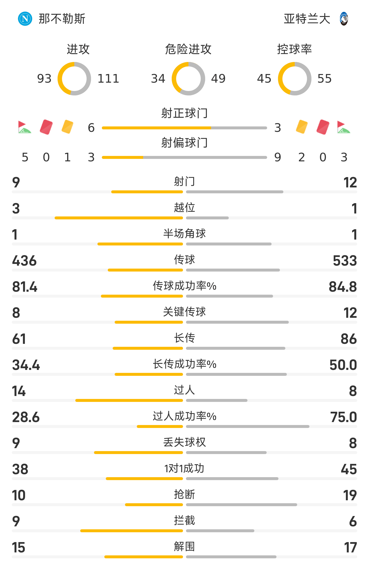 雷速體育11月23日訊 25/26賽季意甲聯(lián)賽第12輪,那不勒斯3-1戰(zhàn)勝亞特蘭大。上半場(chǎng)比賽,內(nèi)雷斯梅開二度,朗半場(chǎng)結(jié)束前再入一球,那不勒斯半場(chǎng)便取得三球領(lǐng)先。易邊再戰(zhàn),斯卡馬卡于第52分鐘扳回一城。但余下的比賽時(shí)間內(nèi),兩隊(duì)均未能再改寫比分,最終亞特蘭大客場(chǎng)不敵那不勒斯,聯(lián)賽8輪不勝。
