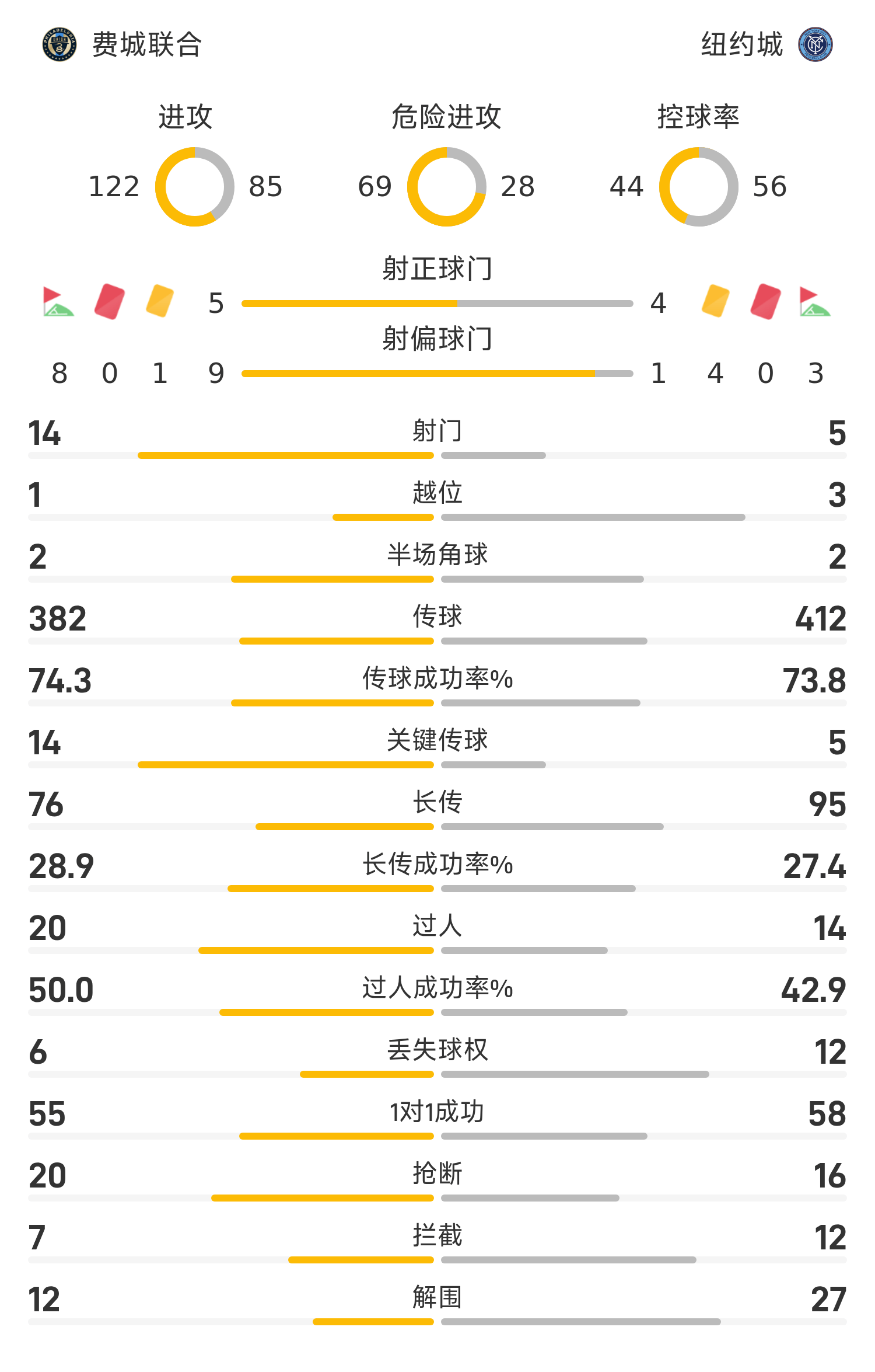 雷速體育11月24日訊 25賽季美職聯(lián)1/4決賽,紐約城1-0戰(zhàn)勝費(fèi)城聯(lián)合。全場(chǎng)比賽,摩拉里斯破門建功。作為常規(guī)賽第一,費(fèi)城聯(lián)合被淘汰出局。而東部決賽,紐約城將對(duì)陣梅西領(lǐng)銜的邁阿密國(guó)際。