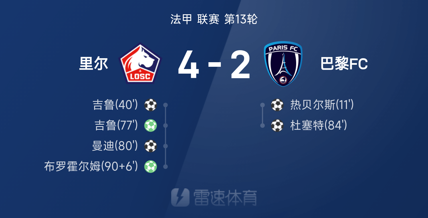 雷速體育11月24日訊 25/26賽季法甲聯(lián)賽第13輪,里爾4-2戰(zhàn)勝巴黎FC。全場(chǎng)比賽,吉魯上演梅開二度,布羅霍爾姆、曼迪破門建功,熱貝爾斯、杜塞特破門難救主。