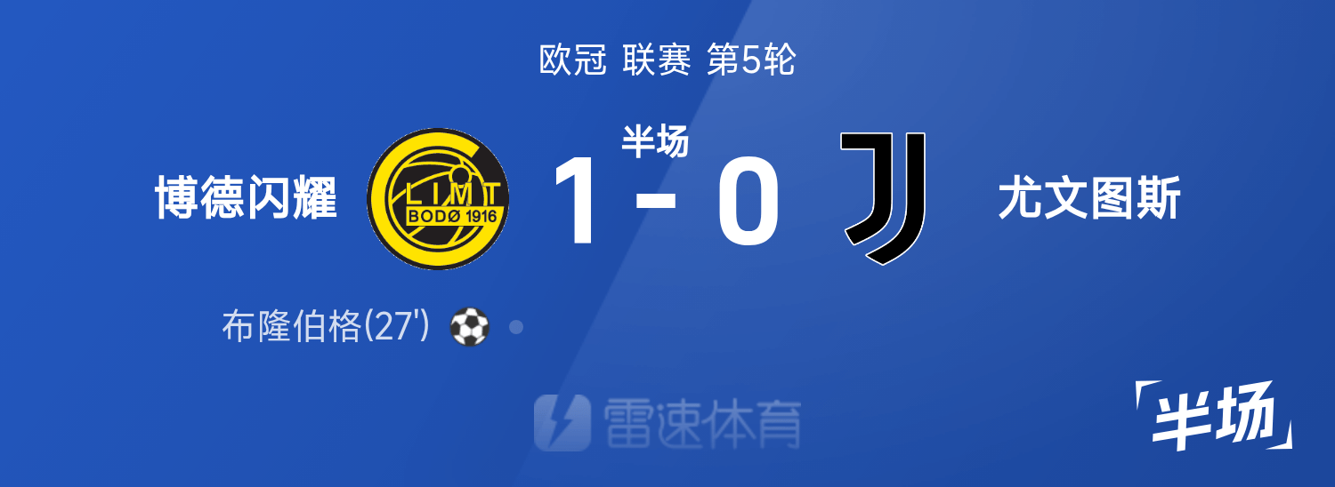 雷速體育11月26日訊 25/26賽季歐冠聯(lián)賽第5輪,博德閃耀迎戰(zhàn)尤文圖斯。半場(chǎng)戰(zhàn)罷,雙方比分暫為博德閃耀1-0尤文圖斯,布隆伯格破門(mén)建功。