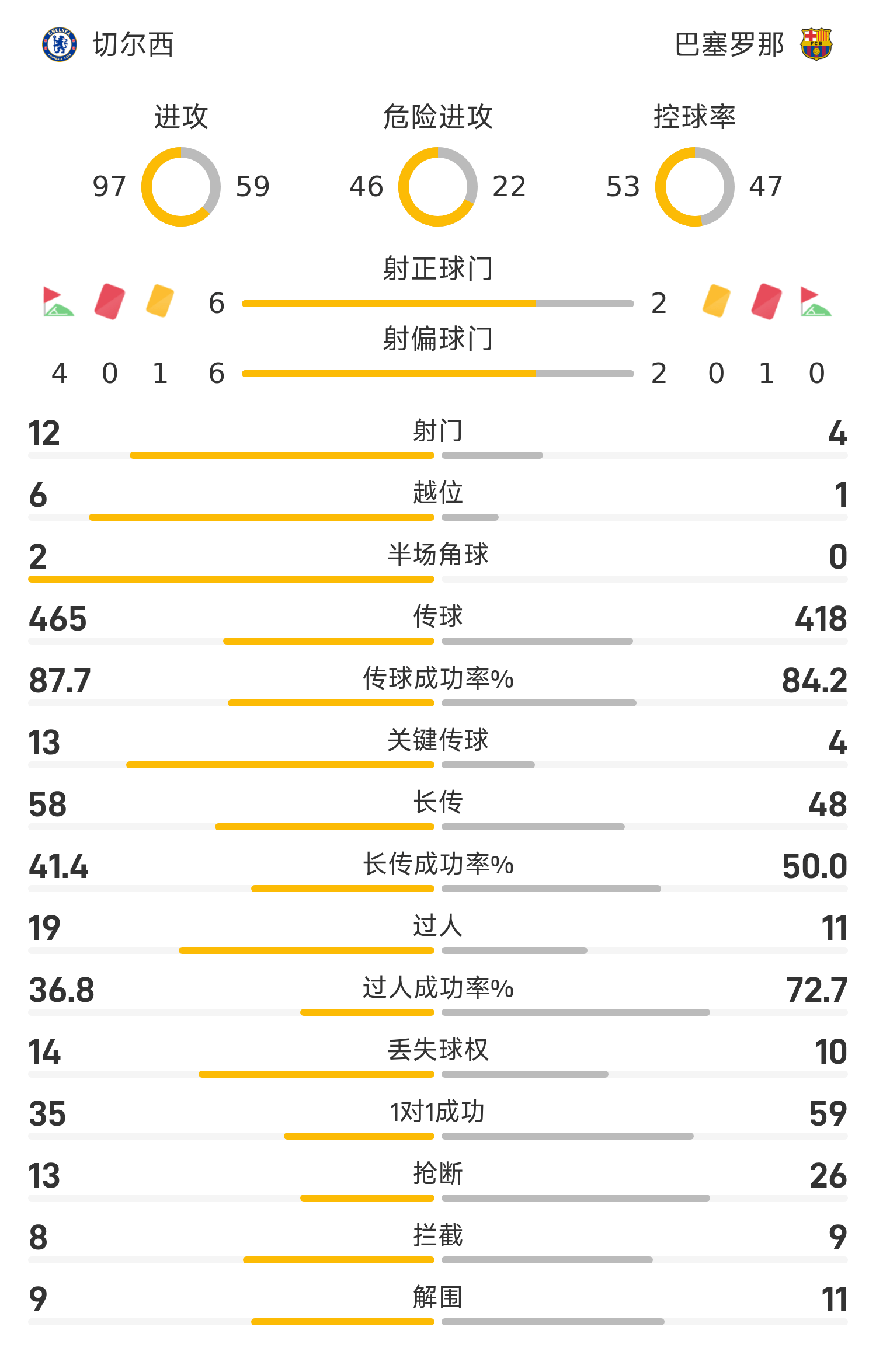 雷速體育11月26日訊 25/26賽季歐冠聯(lián)賽第5輪,切爾西主場以3-0大勝巴塞羅那。上半時比賽,恩佐2個進球被判無效,孔德烏龍送禮,阿勞霍染紅令巴薩僅剩10人應(yīng)戰(zhàn);下半時比賽,埃斯特旺和德拉普聯(lián)袂建功。5輪戰(zhàn)罷,切爾西以3勝1平1負(fù)拿到10分;巴薩以2勝1平2負(fù)僅拿到7分。