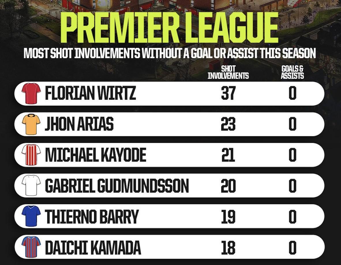 據(jù)統(tǒng)計(jì),維爾茨一共參與了37次射門,是本賽季英超0球0助的球員中最多的。