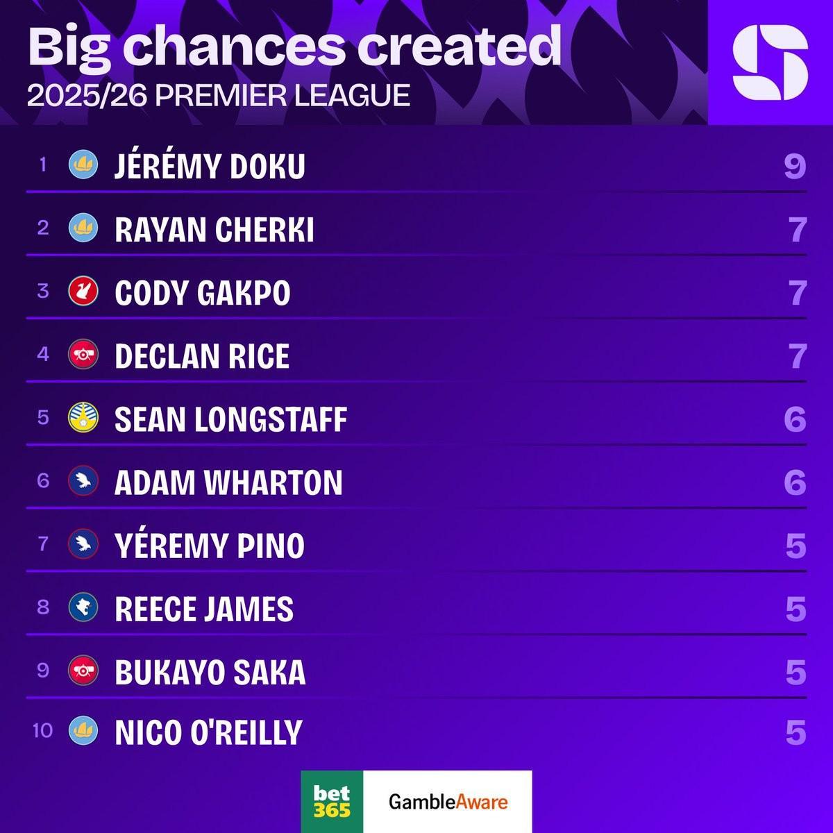 Squawka統(tǒng)計(jì)本賽季至今英超創(chuàng)造絕佳機(jī)會TOP10: