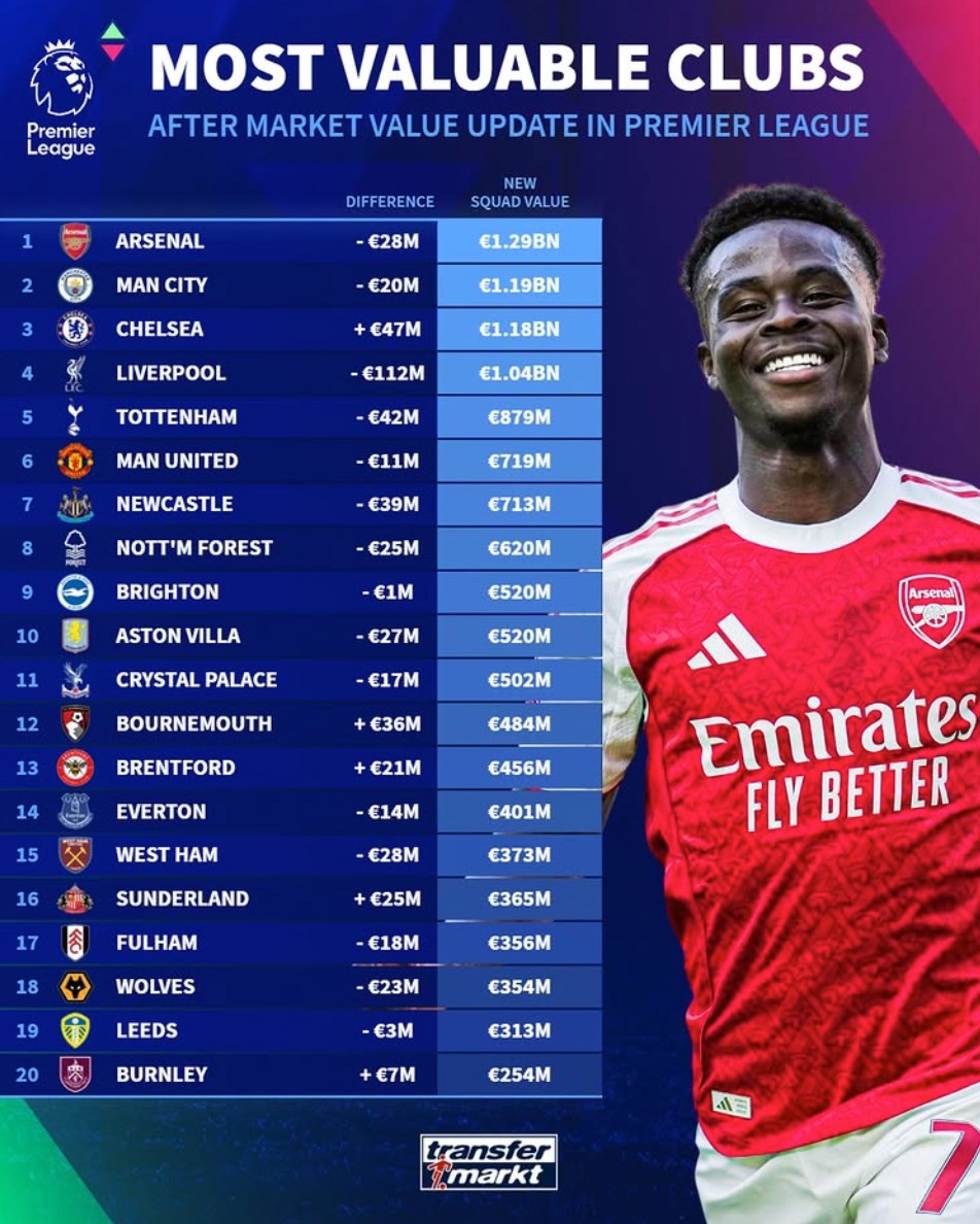 北京時間12月10日,在更新了英超球員的身價之后,德轉(zhuǎn)列出了此次更新后英超20家俱樂部一線隊球員總身價的排名,阿森納此次全隊身價下跌2800萬歐元,但仍以12.9億歐元高居第一,曼城全隊下跌2000萬歐元,以11.9億歐元排名第二,切爾西上漲4700萬歐元,以11.8億歐元排名第三,利物浦全隊的跌幅則高達1.12億歐元,以10.4億歐元排名第四。